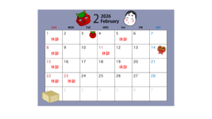 2月のお休みは以下の通りになりますのでご確認のほどよろしくお願いいたします